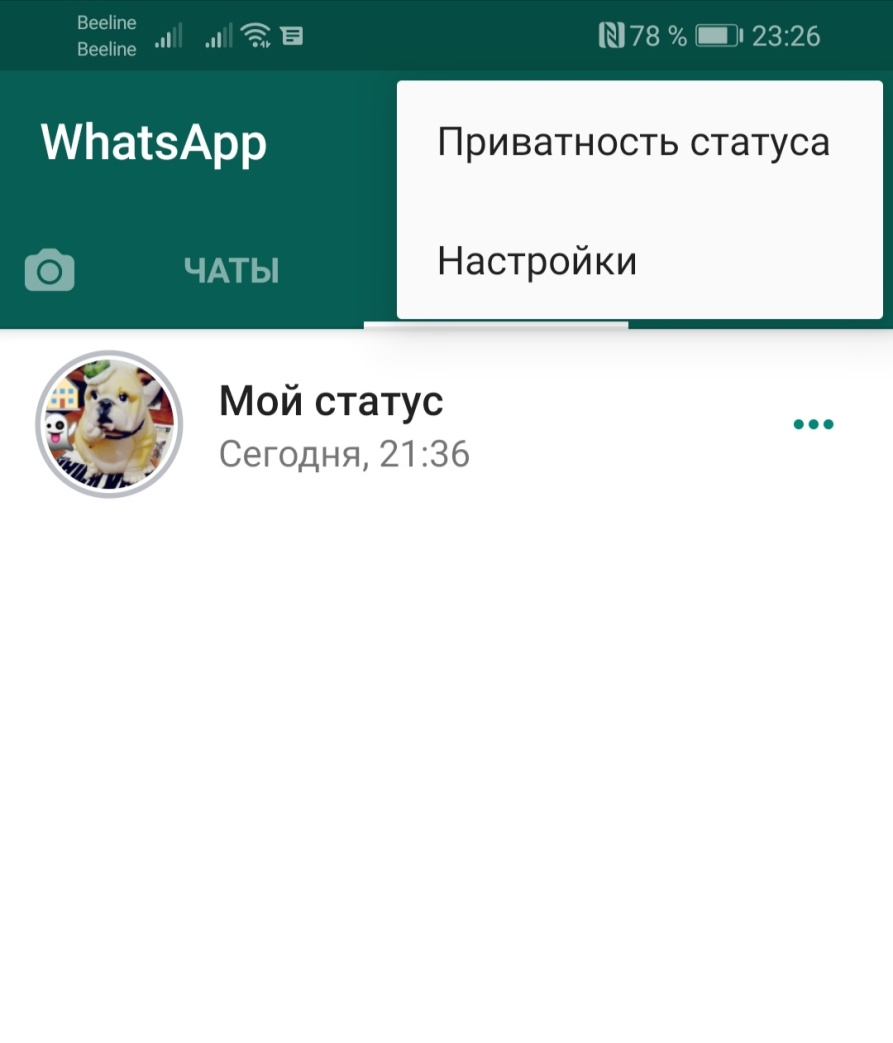 - В правом верхнем углу нажмите на вертикальное троеточие. Во всплывающем меню будет два пункта Приватность статуса и Настройки. Выберите Приватность статуса.