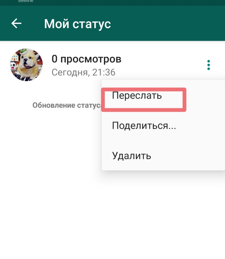 Этот параметр не распространяется на уже выложенную историю. Но если вы хотите, чтобы её точно увидел какой-то конкретный человек, нажмите на иконку с тремя точками справа от текущего статуса, и во всплывающем меню выберите пункт Переслать. Так вы отправите историю личным сообщением нужному контакту.